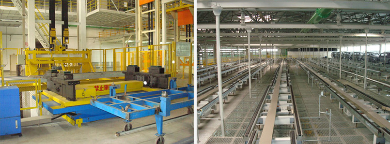 白车身从原来的升降段提升到系统上线处,接车后输送到焊装空中存储线,在由存储线输送到涂装车间,白车身在上线升降段提到到位,M1、M2车在地面通过从焊装到涂装的储存线的升降段进入焊装至涂装储存线的全部工位,包括链式滚床、升降段等。在车身经升降段进入空中储存线的结构平台后,设置打号机操作区,滚床储存线和打号机具有通信和连锁功能。该设备的生产节拍为110s/台,A1车焊装空中储存区设计的白车身储存量为100台。白车身从焊装车间进入涂装车间的方式为过廊,在过廊设置三条滚床输送线,过廊两端设置带式升降机。A1车身焊装储存线设车身自动分类编组功能,焊装至涂装的三条输送线,分别对应A1、M1、M2车身的自动分组输送功能。A1车身焊装储存线和焊装至涂装储存线中包含横移机和旋转台,并在附近设一操作台,便于手动和自动的切换。电气控制系统采用PLC、总线控制方式,控制系统配置人机界面的触摸屏,实现人机交流。