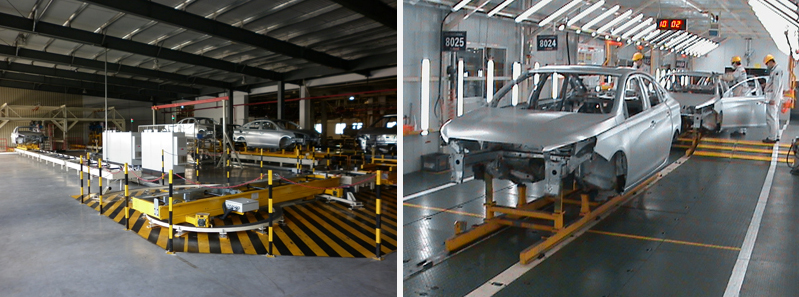 神龙一工厂焊装输送线生产线包括:空中滑橇输送线、主车身生产线升降机、地面调整线输送线、以及焊油悬链,共10条输送线。它适用于TX9/T9多品种车型总成混流生产。全车间机械设备和电控设备,严格按照神龙DPCA法国标准执行。输送线配置有CS控制系统,实现实时监控现场设备、车身储存区出入车辆调度、设备故障报警提示等功能,实现了车辆的信息化管理。